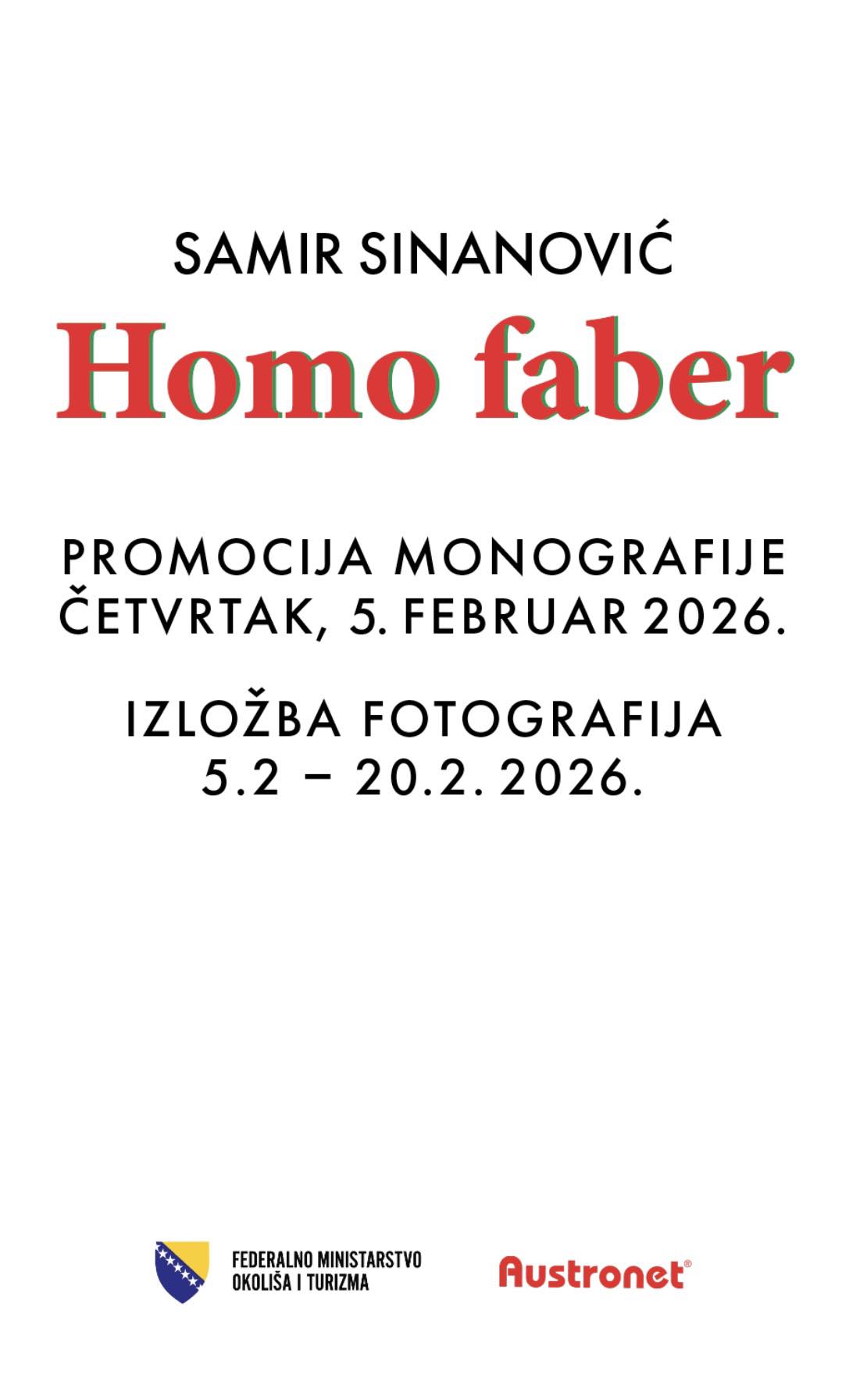 U Umjetničkoj galeriji Bosne i Hercegovine u Sarajevu, u četvrtak 5. februara 2026. godine s početkom u 19 sati, bit će upriličena promocija monografije Homo faber i otvorena istoimena izložba fotografija Samira Sinanovića.