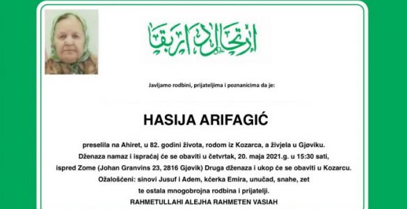 Tužna srca obavještavamo familiju, komšije i prijatelje da je naša draga: Hasija Arifagić preselila na Ahiret dana 13. maja 2021. godine u 82. godini života. RAHMETULLAHI ALEJHI-HA RAHMETEN VASIAH! Dženaza će se obaviti...