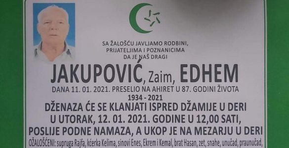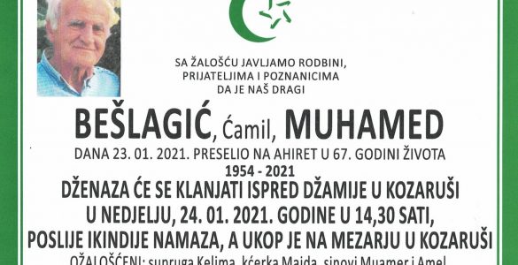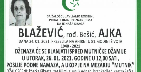 Tužna srca obavještavamo familiju, komšije i prijatelje da je naša draga: Blažević (rođ. Bešić) Ajka preselila na Ahiret dana 24. januara 2021. godine u 81. godini života. RAHMETULLAHI ALEJHI-HA RAHMETEN VASIAH! Dženaza...
