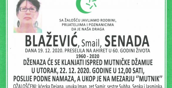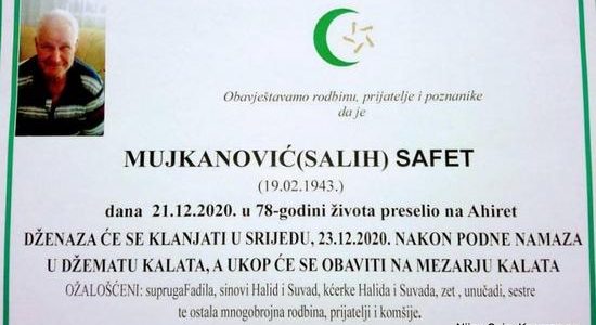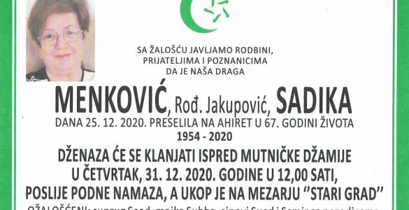 Tužna srca obavještavamo familiju, komšije i prijatelje da je naša draga: Menković (rođ. Jakupović) Sadika preselila na Ahiret dana 25. decembra 2020. godine u 67. godini života. RAHMETULLAHI ALEJHI-HA RAHMETEN VASIAH...