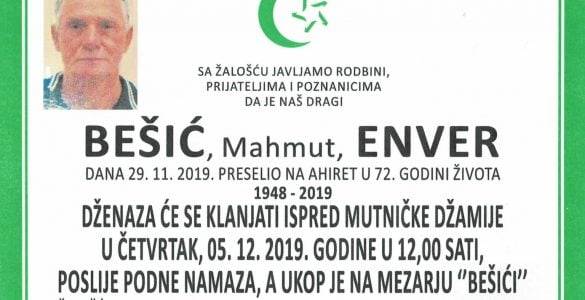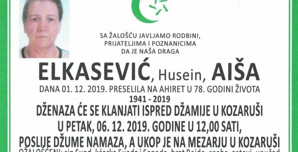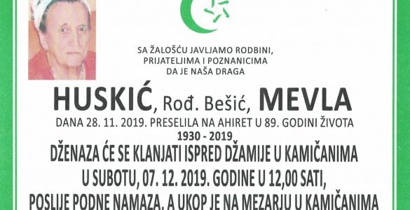 Tužna srca obavještavamo familiju, komšije i prijatelje da je naša draga: Huskić (rođ. Bešić) Mevla preselila na Ahiret dana 28. novembra 2019. godine u 89. godini života. RAHMETULLAHI ALEJHI-HA RAHMETEN VASIAH! Dženaza...