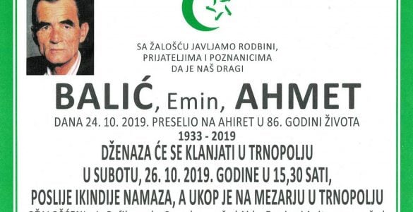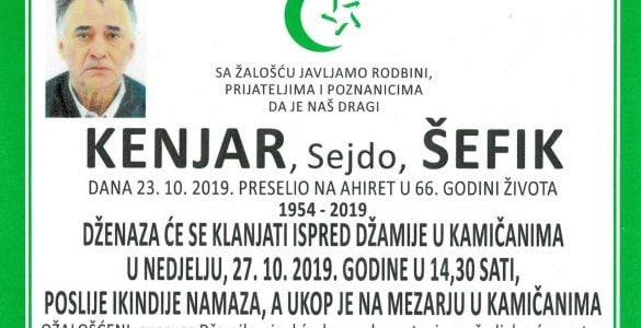 Tužna srca obavještavamo familiju, komšije i prijatelje da je naš dragi: Kenjar (Sejdo) Šefik preselio na Ahiret dana 23. oktobra 2019. godine u 66. godini života. RAHMETULLAHI ALEJHI-HA RAHMETEN VASIAH! Dženaza će se...