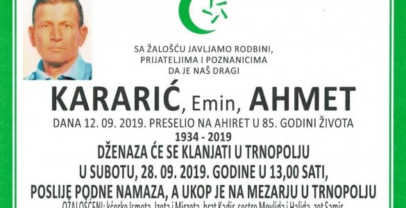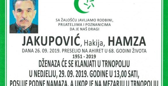 Tužna srca obavještavamo familiju, komšije i prijatelje da je naš dragi: Jakupović (Hakija) Hamza preselio na Ahiret dana 26. septembra 2019. godine u 68. godini života. Dženaza će se klanjati ispred džemije u Trnopolju...